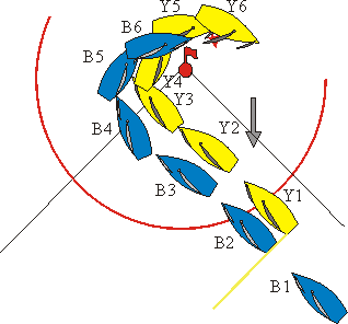 Amarillo entra en la zona libre a proa de Azul. Ambos barcos viran por