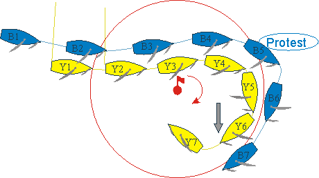 Cuando Amarillo entra en la zona los barcos estan en bordadas opuestas