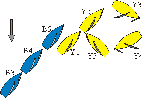 esloras por delante de Azul. Amarillo arriba, traslucha, orza entonces