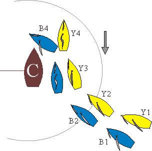 Pregunta Entre las situaciones 3 y 4 Azul hace un cambio de rumbo grande y rápido poniendo su foque a la contra para arribar y no da espacio a Amarillo para mantenerse separado. Hay contacto entre Azul y Amarillo. Ambos barcos muestran bandera Y. ¿Cuál debe ser la decisión? Respuesta |