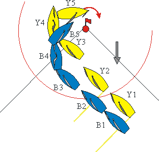 Amarillo entra en la zona libre a proa de Azul. Ambos barcos viran por