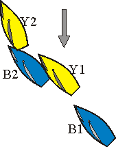 Jaune lofe immédiatement, et sa poupe touche Bleu. Un pavillon