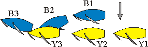 Jaune navigue plus vite que Bleu. Bleu laisse porter et les bateaux deviennent