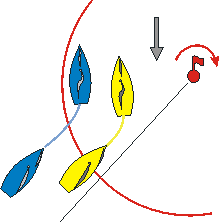Bleu et Jaune approchent de la marque au vent, engagés bâbord