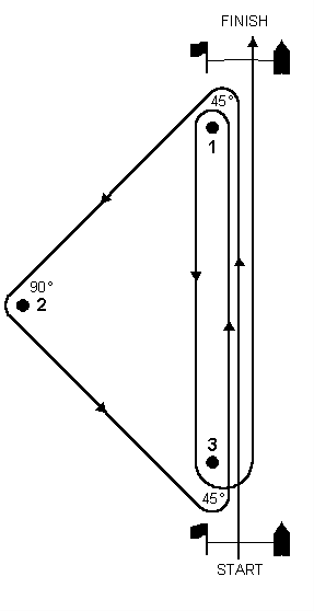 Trojuholníková trať s karuselom Štart – 1 – 2 – 3 – 1 – 3 – Cieľ Možnosti pri použití tejto trate sú: (1) (1) pridanie alebo zmenšenie počtu kôl (2) zrušenie posledného úseku proti vetru (3) zmena vnútorných uhlov trojuholníka